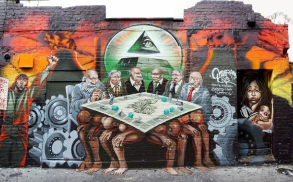 Together they walked down the road. The fabric shops were closing, the grocers still optimistically staying open. The air was thick with the spices of Indian cooking: hot oil, turmeric, garlic. Tariq paused for a minute by a huge mural that decorated a blank brick wall. He had often studied it, and rarely passed without another admiring glance. Seated in a semi-circle, staring towards the viewer, were six figures, with a large flat board spread before them. The square surface was marked out as a kind of board game, at its centre a pile of green American dollars. Among the counters were miniatures of the Statue of Liberty, the Eiffel Tower, the Gherkin, monuments of western capitalism.